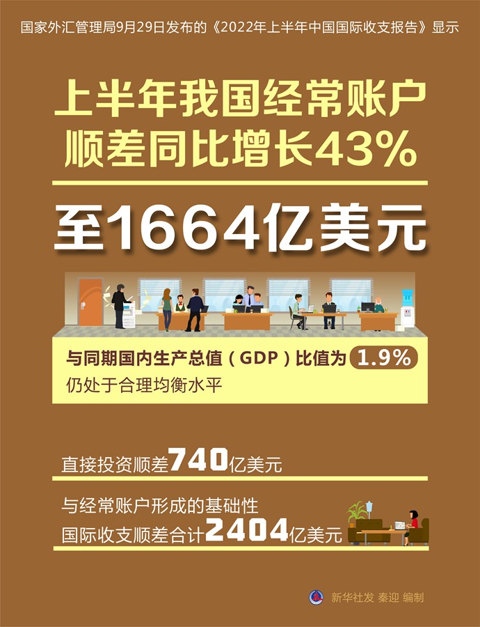 9月29日电(记者刘开雄)国家外汇管理局29日发布的《2022年上半年中国国际收支报告》显示,2022年上半年,我国经常账户顺差1664亿美元,同比增长43%,与同期国内生产总值(GDP)比值为1.9%,仍处于合理均衡水平。