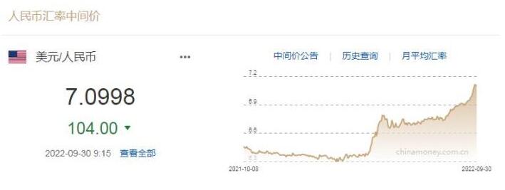 9月30日人民币对美元中间价报7.0998调升104个基点
