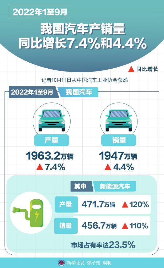 北京10月11日电(记者高亢、戴小河)记者11日从中国汽车工业协会获悉,今年1至9月,我国汽车产销量分别达1963.2万辆和1947万辆,同比增长7.4%和4.4%。其中,新能源汽车产销量分别达471.7万辆和456.7万辆,同比增长120%和110%,市场占有率达23.5%。