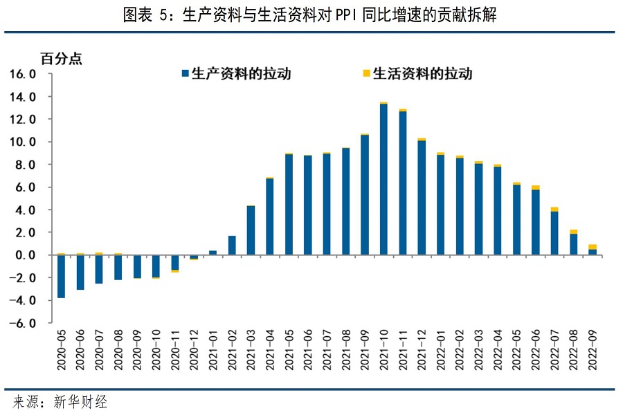 本阶段,生产资料主导PPI的变化。9月份,生产资料价格同比上涨0.6%,拉高工业生产者出厂价格增速0.49个百分点,是PPI涨幅的主要贡献项。其中,采掘工业价格上涨3.5%,原材料工业价格上涨5.8%,加工工业价格下降1.9%。生活资料价格同比上涨1.8%,拉高工业生产者出厂价格约0.41个百分点。其中,食品、衣着价格、一般日用品分别上涨4.1%、2.3%、1.6%,耐用消费品价格下降0.6%。