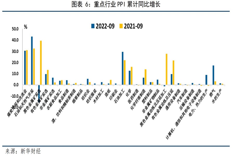 9月PPI同比在基数走高下延续大幅回落,但环比降幅收窄,一是国际原油价格降幅收窄带动石化产业链价格环比回升。二是国内建筑业需求回暖,地产“保交楼”项目推进、基建实物工作量逐渐落地,且天气转凉有助于建筑施工加速开展,带动了金属、水泥等相关行业需求回升,价格降幅均有收窄。三是人民币汇率贬值,受美元指数快速上行等因素影响,离岸人民币相对美元的汇率在8月15日至9月30日间贬值幅度接近6%,提升了部分工业原材料的进口成本,推了升PPI增速。