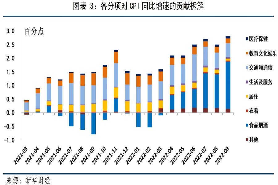 具体来看,9月新涨价因素贡献了当月CPI中2个百分点的涨幅,贡献扩大0.3个百分点,新涨价因素对CPI同比涨幅的贡献率达到71%;翘尾因素贡献了0.8个百分点的增长,贡献持平于7月,贡献率为29%。