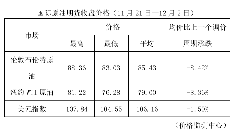 根据国家发改委消息,新一轮成品油调价窗口将于12月5日24时开启。据国家发改委价格监测中心监测,本轮成品油调价周期内(11月21日—12月2日)国际油价大幅下降。平均来看,伦敦布伦特、纽约WTI油价比上轮调价周期下降8.39%。