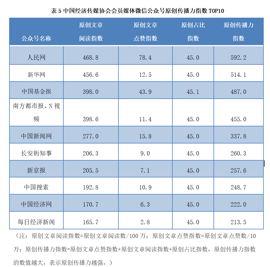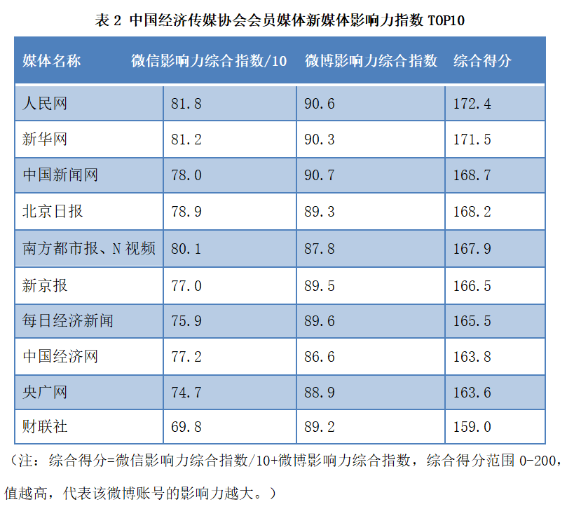 新媒体影响力指数由微信影响力指数、微博影响力综合指数求和而得。其中,榜单从总阅读指数、总点赞数、总在看量、原创文章总阅读量等21个维度综合评估会员媒体微信公众号影响力指数;从微博账号的总阅读量、发文量、总点赞量、新增粉丝数等22个维度综合评估微博影响力指数。
