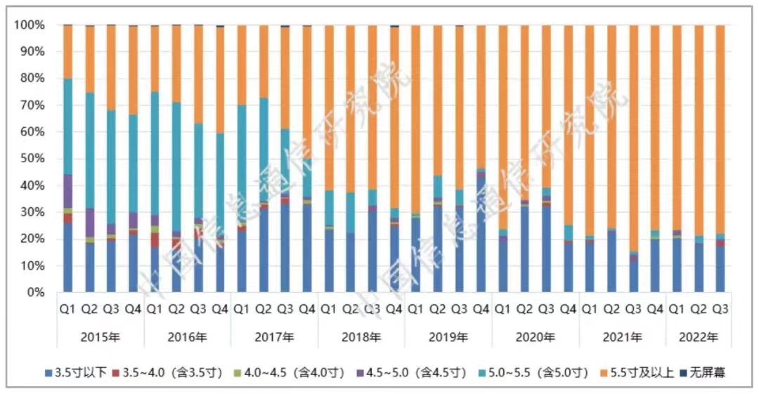 中国信通院发布的《国内手机产品交互载体特性监测报告(2022年第三期)》显示,2022年第三季度我国上市的手机中,5英寸及以上大屏手机款型占比79.8%,其中5G手机大屏占比达100%,4G手机大屏占比为72.2%。