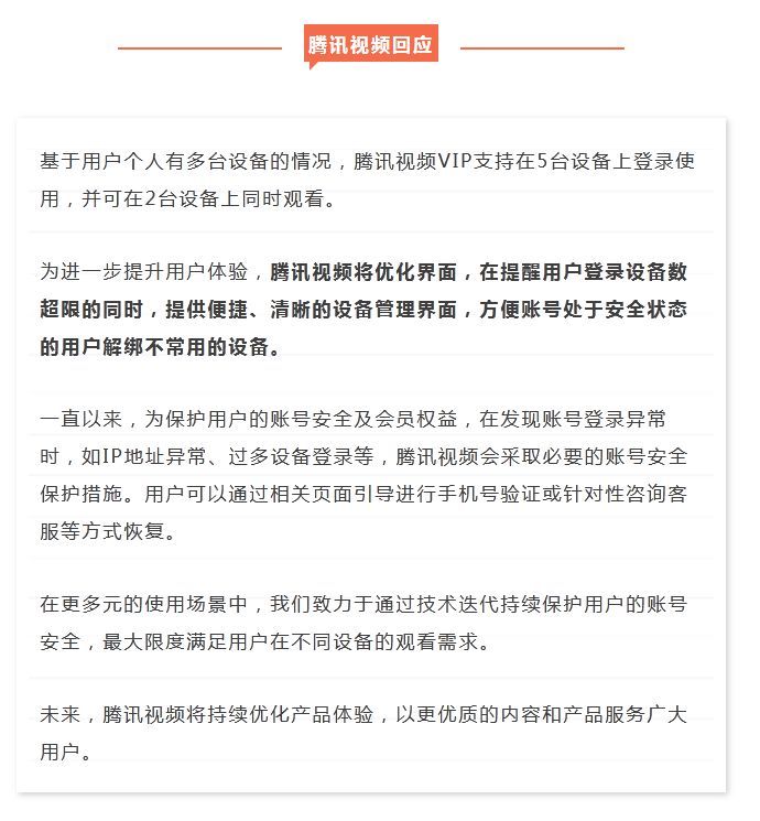 对此,腾讯视频回应:基于用户个人有多台设备的情况,腾讯视频VIP支持在5台设备上登录使用,并可在2台设备上同时观看。为进一步提升用户体验,腾讯视频将优化界面,在提醒用户登录设备数超限的同时,提供便捷、清晰的设备管理界面,方便账号处于安全状态的用户解绑不常用的设备。