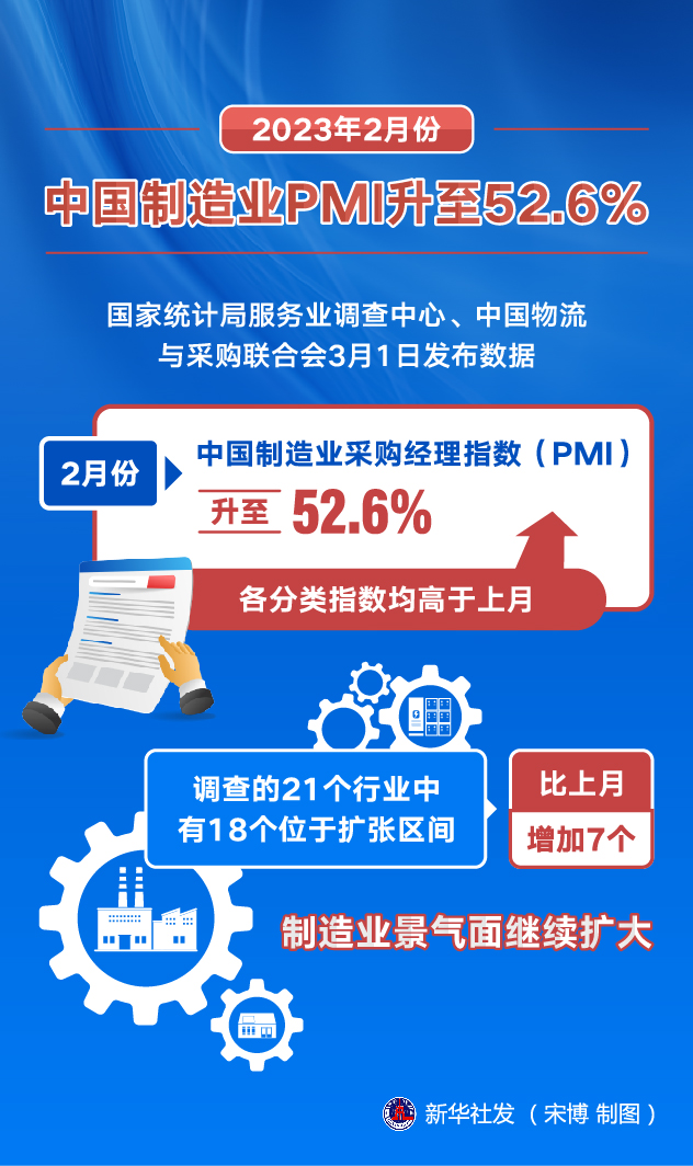 北京3月1日电(记者魏玉坤、王聿昊)国家统计局服务业调查中心、中国物流与采购联合会1日发布数据,2月份,中国制造业采购经理指数(PMI)升至52.6%,各分类指数均高于上月,调查的21个行业中有18个位于扩张区间,比上月增加7个,制造业景气面继续扩大。