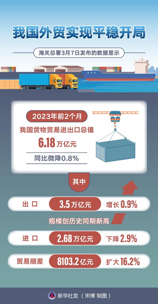 北京3月7日电(记者邹多为、魏一骏)海关总署7日发布的数据显示,今年前2个月,我国货物贸易进出口总值6.18万亿元,同比微降0.8%。其中,出口3.5万亿元,增长0.9%,规模创历史同期新高;进口2.68万亿元,下降2.9%;贸易顺差8103.2亿元,扩大16.2%。