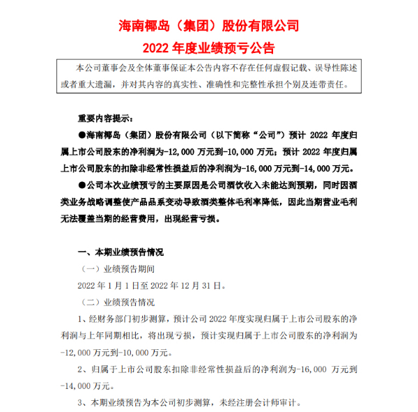 海南椰岛发布的2022年度业绩预亏公告显示,2022年预计实现净利润为亏损1亿元到1.2亿元。保健酒作为海南椰岛的主业,鹿龟酒系列和海王酒系列近年来销售低迷,前景不容乐观。