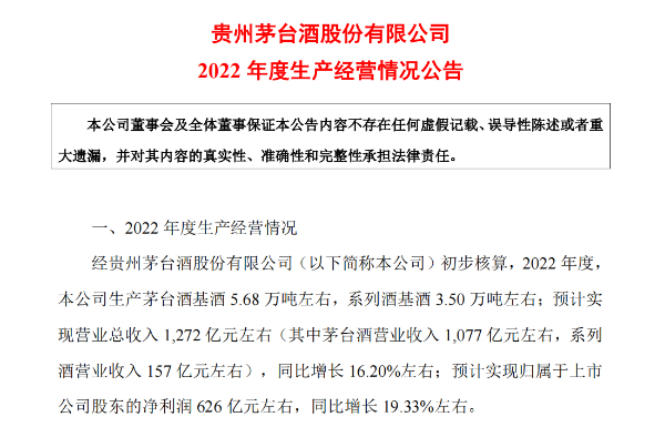 数据显示,2022年,茅台预计实现营业总收入1272亿元左右,同比增长16.2%左右。其中茅台酒营业收入约1077亿左右,系列酒营业收入157亿元左右。预计实现归属于上市公司股东的净利润为626亿元左右,同比增长19.33%。