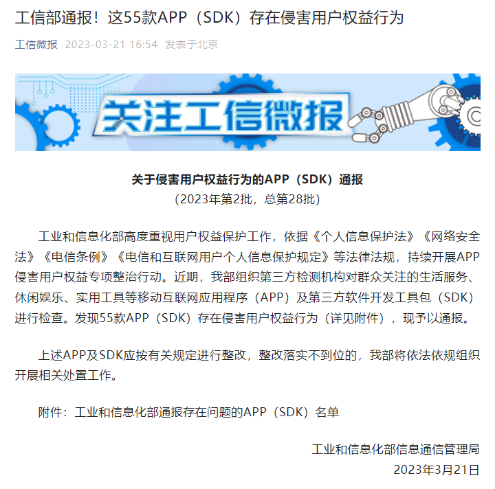 工业和信息化部高度重视用户权益保护工作,依据《个人信息保护法》《网络安全法》《电信条例》《电信和互联网用户个人信息保护规定》等法律法规,持续开展APP侵害用户权益专项整治行动。近期,我部组织第三方检测机构对群众关注的生活服务、休闲娱乐、实用工具等移动互联网应用程序(APP)及第三方软件开发工具包(SDK)进行检查。发现55款APP(SDK)存在侵害用户权益行为(详见附件),现予以通报。