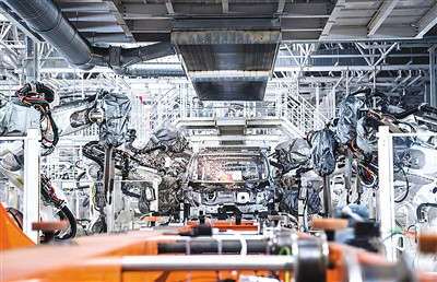 焊装机器人在吉林长春中国第一汽车集团有限公司焊装车间内焊接车身