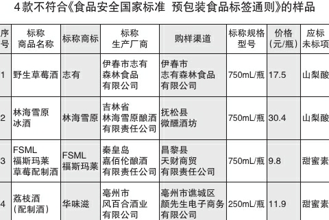 本次比较试验对35款样品的防腐剂、色素、甜味剂等常见食品添加剂进行了检测。结果发现,所有样品的各添加剂含量均符合相关标准要求。查验添加剂的标示情况后,发现4款样品分别检出山梨酸、甜蜜素,但未在配料中予以标示,不符合GB7718—2011《食品安全国家标准预包装食品标签通则》的要求。这4款样品分别为:标称生产厂商为伊春市志有森林食品有限公司、标称商标为“志有”的野生蓝莓酒,应标未标项目为山梨酸;标称生产厂商为吉林省林海雪原酿酒有限责任公司、由抚松县微醺酒坊销售的林海雪原冰酒,应标未标项目为山梨酸;标称生产厂商为秦皇岛嘉佰伦酿酒有限责任公司、由昌黎县天财商贸有限责任公司销售的FSML福斯玛莱草莓味配制酒,应标未标项目为甜蜜素;标称生产厂商为亳州市风百合酒业有限公司、由亳州市谯城区颜先生电子商务有限公司销售、标称商标为“华味滋”的荔枝酒(配制酒),应标未标项目为甜蜜素。