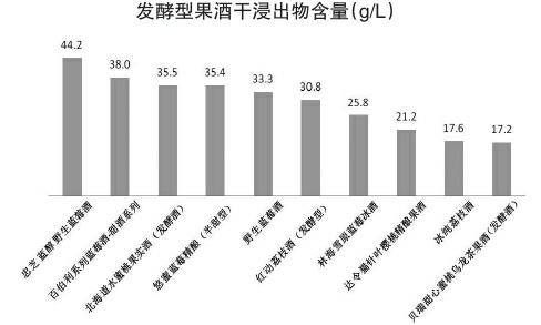 上海市消保委指出,果酒中到底有多少水果成分是消费者普遍关心的问题。“干浸出物”是衡量发酵型果酒果汁含量高低的重要指标,通常,干浸出物含量越高,果汁含量越高。本次比较试验发现,10款发酵型果酒的干浸出物含量在17.2—44.2g/L之间,整体含量较高。