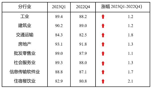 企业效益状况有所改善。企业生产经营加速恢复,原材料价格涨幅收窄,以及延续优化减税降费政策减轻企业负担,小微企业利润有所改善。一季度,效益指数为74.6,比上季度上升1.6点,反弹幅度较大,但仍处于历史较低位。所调查的八个行业效益指数均有所上升。