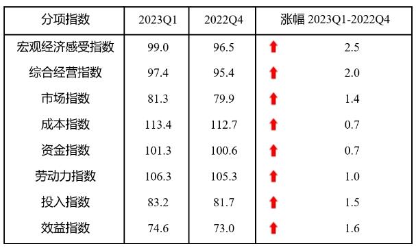 答:企业发展信心继续回升。今年以来,我国经济运行持续回暖,增长动能不断释放,发展信心明显增强。一季度,反映企业信心状况的宏观经济感受指数为99.0,比上季度上升2.5点,升幅最大。从宏观经济感受指数的细项看,宏观感受指数为103.6,比上季度上升2.4点,高于景气临界值100;行业运行指数为94.3,比上季度上升2.6点,升幅较大。