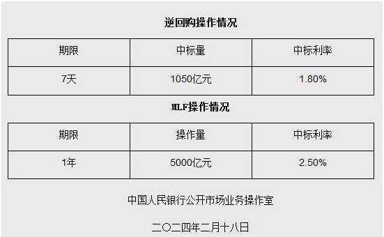 2月18日电 据央行网站消息,为维护银行体系流动性合理充裕,2024年2月18日人民银行开展1050亿元公开市场逆回购操作和5000亿元中期借贷便利(MLF)操作。具体情况如下: