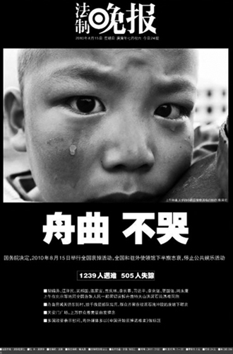 8月15日,天安门广场下半旗,对甘肃舟曲特大山洪泥石流遇难同胞表达哀思。这是继汶川特大地震和玉树地震之后,五星红旗第三度为普通国民而降。在这个哀伤的日子里,全国各地的新闻媒体又一次将版面、频道、网页化作情感的容器盛放悲伤,以自己独有的方式为遭遇劫难的同胞哀悼、为劫后余生的舟曲祈福。