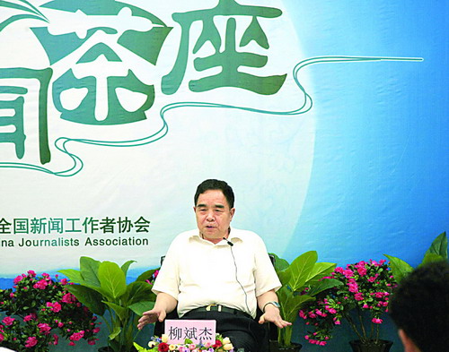新闻茶座上,国家新闻出版总署署长柳斌杰就相关问题发言并回答中外记者提问。记者 赵洪波摄
