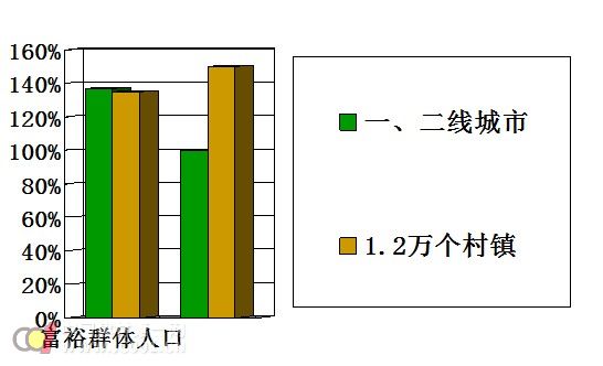 全国有1.2万个小村镇和2000个县城,1.2万个村镇家庭总收入比一、二线城市家庭收入总和高出50%,潜在富裕群体人口1.35亿,与一、二级城市总人口1.37亿相当。