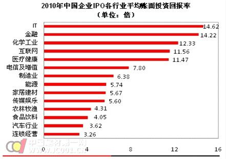 2010年490家IPO中国企业,融资额达1068.75亿美元,家居建材行业平均账面投资回报率为5.67倍,属于中等水平。
