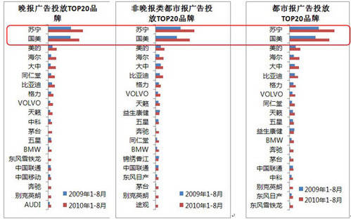 从晚报广告投放的品牌分布看,家电零售巨头苏宁和国美独占鳌头,与都市报的品牌构成情况基本一致。汽车和家电业的品牌占据了TOP20的大部分品牌。另外,医药类的同仁堂在晚报的排名高于非晚报类都市报。