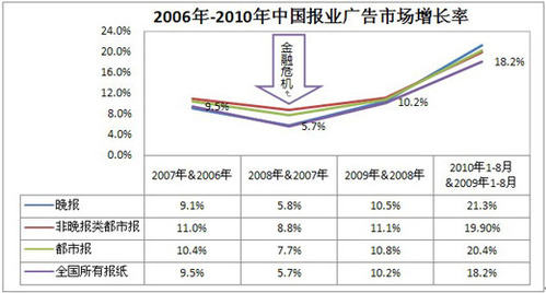 国内报纸中,综合都市报的广告份额占到近80%,晚报作为综合都市报的细分种类,其广告投放额占到都市报中的1/3份额左右。2009年,晚报全年的广告额达到268亿元;截止2010年8月,晚报的广告额达到193亿,同比增长21.3%。非晚报类都市报2009年的广告额达到485.5亿,截止2010年8月,非晚报类广告额达340亿,同比增长19.9%。