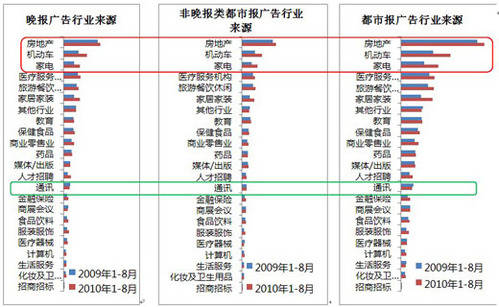 从2009-2010年同期全国晚报广告行业来源与都市报广告行业的结构基本一致,慧聪邓白氏报纸广告监测数据显示,房地产、机动车、家电行业是晚报以及非晚报类都市报广告投放额度最高的TOP3行业。除通讯类2010年对比2009年同期广告投放额度略有下降外,其他22个行业均呈上升趋势。