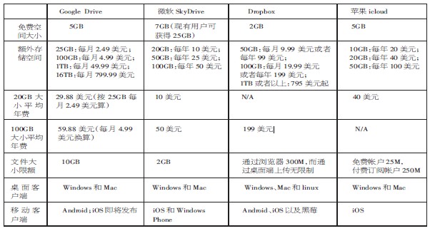 7月初,南京某女士丢失其iPhone 4S,被一女捡到,私吞之余自拍,不想此机为5.0.1系统,于是被iCloud同步给失主,失主怒传其照片至网上。随后,这条微博就被疯转。很快,“拾金而昧者”就被“人肉”出来,而这也让中国用户于iPhone 4S在国内市场正式发售之前,彻彻底底地认识了iCloud和个人云存储——这类服务最大的特点,就是支持包括PC、智能手机、平板电脑等在内的几乎所有客户端。而最近一段时间,不管是百度、华为、360、中国电信,还是刚刚上线云存储服务的中国移动,纷纷涉足云存储服务,表明云存储成为互联网巨头争抢的另一热门领域。那么,日前涉足云存储服务的国内互联网巨头跟国外云存储的“四大天王”苹果、谷歌、微软、dropbox从价格、收费模式、存储空间、支持应用种类等多个方面相比有什么优劣势?