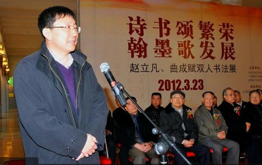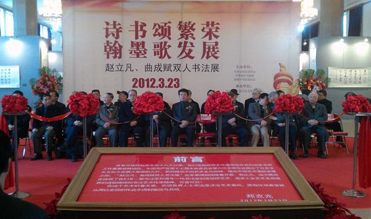 中国产业报协会网、中国产业网联合讯:“诗书颂繁荣,翰墨歌发展”-----赵立凡、曲成赋双人书法展3月23日—25日在北京军事博物馆举行。中国文联党组副书记,副主席覃志刚、全国政协原副秘书长,北京世纪名人国际书画院院长张道诚、著名学者,书法教育家,博士后导师欧阳中石、中国书法家协会顾问李铎、中国书法家协会顾问权希军、中国经济报刊协会副会长宋波,中国产业媒体联盟秘书长,中国产业报协会副秘书长胡英暖等领导和嘉宾出席了本次开幕式并观看了画展。