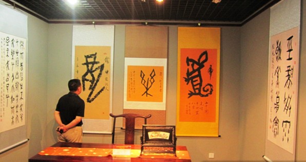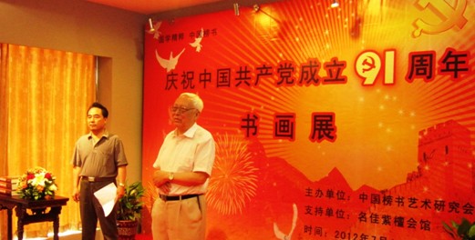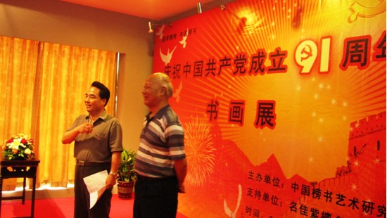 著名书法家,中国榜书艺术研究会李力生在欢迎致辞中表示,“庆祝中国共产党成立91年书画展”的主要内容:一是在中国共产党91华诞的日子里,在如此好的环境中,大家聚在一起,就榜书书法作品相互观摩,相互切磋与交流。书法艺术相互切磋与交流是非常重要的。书法艺术家,书法爱好者,假如整天关起门来自己写字作画,生活在自己的满足中,等将作品拿到社会上,大庭广众中就会发现不足。古代书法家、书法爱好者也是经常在一起切磋交流的,但他们没有我们这样好的条件。如,米芾就经常三五人一起观摩、切磋交流,借此提高水平,练就眼力。我们这个研究会就是要经常创造这样的环境和场所,让大家彼此观摩、切磋交流,提高思想与艺术水平。