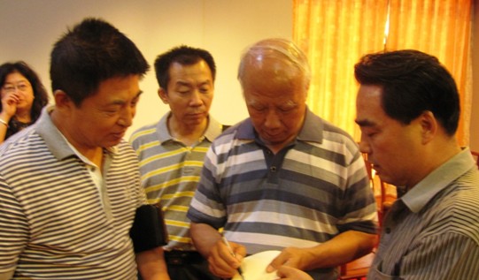 李力生会长正在向观摩他书法作品的嘉宾分享他的创作心得